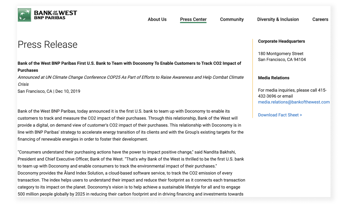 Bank of the West BNP Paribas, announced it is the first U.S. bank to enable its customers to track and measure the CO2 impact of their purchases in December 2019.