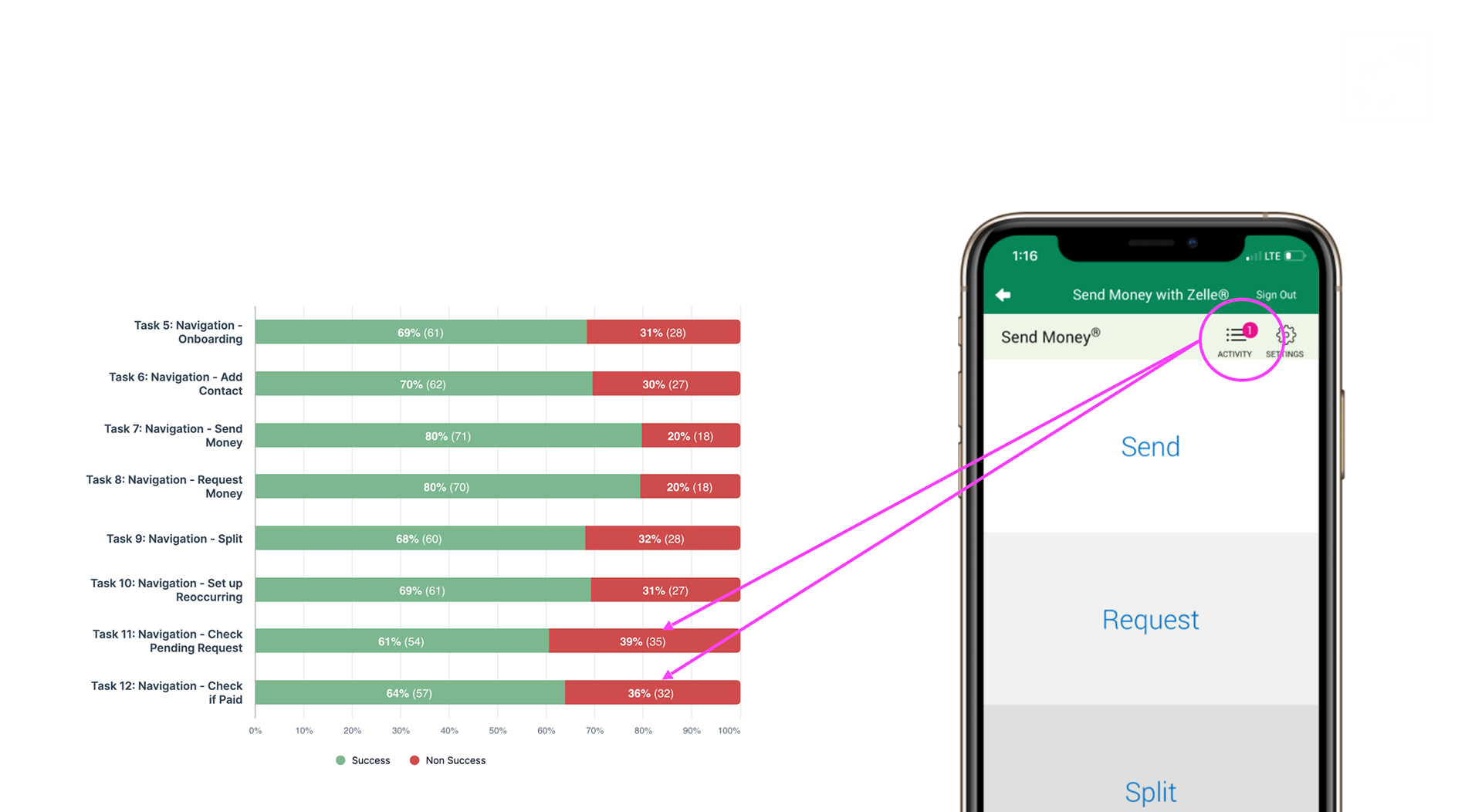 Sending and Requesting money had a success rate of 80%. Indicating that navigating to and through the process of sending and requesting was easier than other tasks.