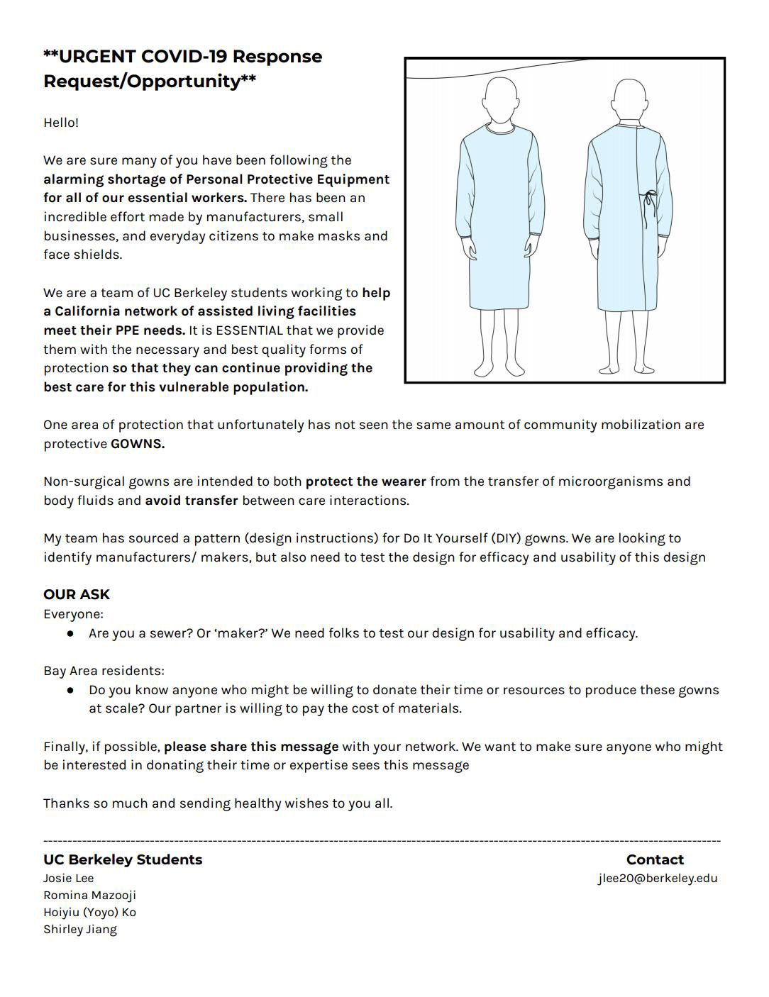After we came up with a plan on how we would create PPE we created flyers we created flyers and sent them to all UC Berkeley students and posted on social media.